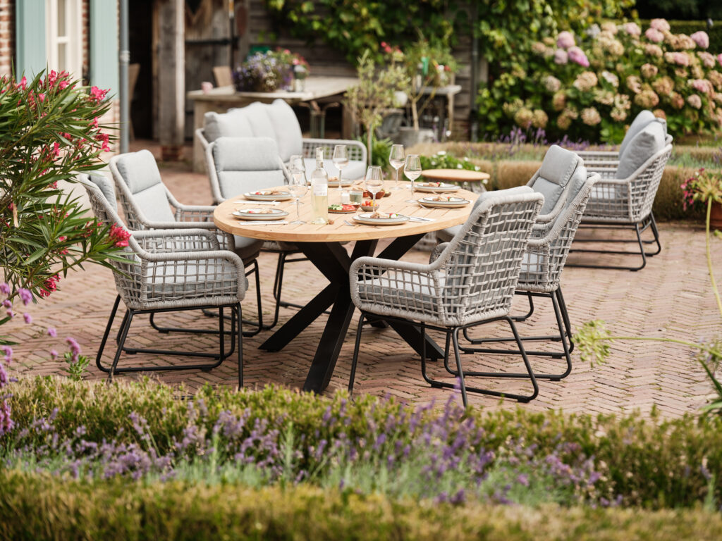 De Jerome-serie combineert strakke lijnen met organische vormen en gebruikt materialen zoals rope en wicker vlechtwerk met rope-look naar keuze. Deze serie biedt een warme, eigentijdse uitstraling, ideaal voor trendy buitenruimtes.